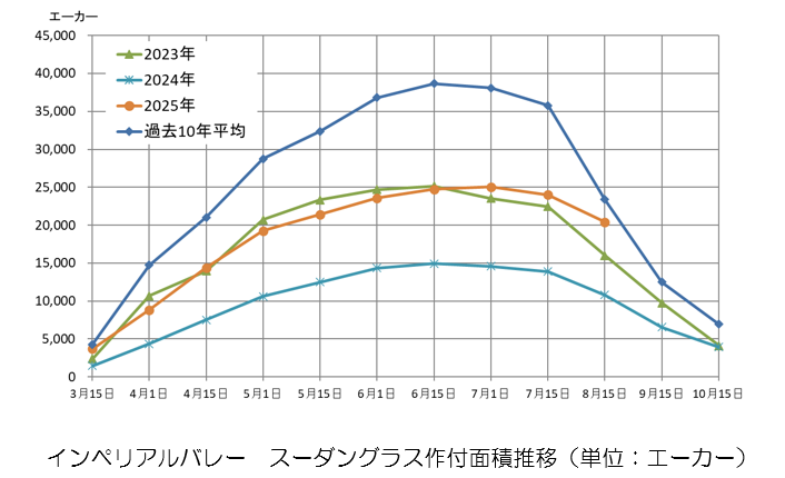 主産地であるカリフォルニア州南部インペリアルバレーでは、3番刈の収穫作業が終了しており、DIP(休耕地政策)を行っていない圃場で4番刈の収穫が開始されています。DIP終了後に再度生産を実施する圃場もある見通しですが、中~低級の発生となる見込みです。灌漑局の発表によると、2025年8月15日時点でのクレイングラスの作付面積は23,341エーカーとなっており、前年同期の21,067エーカーから増加しています。 作付面積は増加しているものの、繰り越し在庫は限定的となっており、韓国向け需要や、今後の相場次第では生産量を需要が上回ることも考えられるため注視が必要です。 |