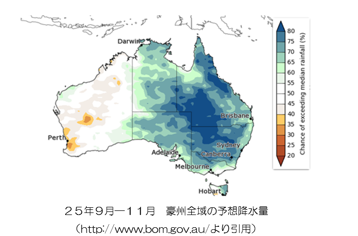 産地では、今後、収穫期を迎えますが、オーストラリア気象庁の予報では東豪州で降雨、西豪州では乾燥が見込まれています。この気象条件により、東豪州では中〜下級品の発生が増え、西豪州では上級品が中心となる見通しですが、今後の天候の推移には引き続き注意が必要です。 夏季の需要減や米国新穀の供給開始の影響で、輸出需要は軟化していますが、豪州国内の引き合いは依然として堅調に推移しています。 |